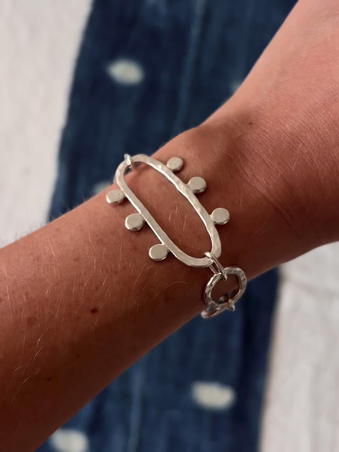 A favorite design, the third I have made with this motif - the center piece features six hand formed silver embellishments, each individually soldered on. Each link shaped by hand and finished with a hammered texture, completed with a stylish hook clasp