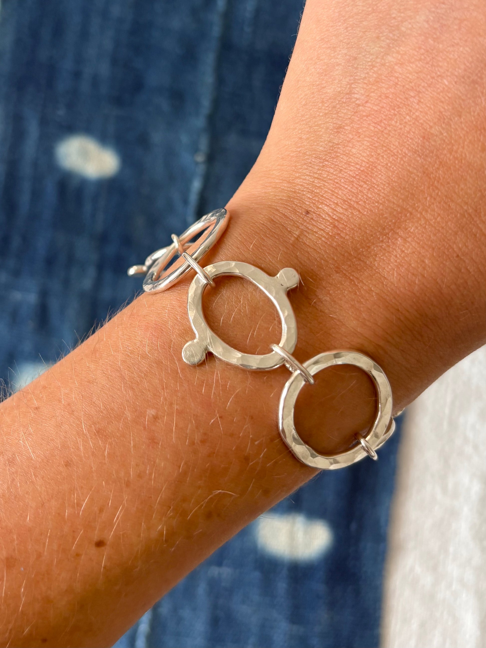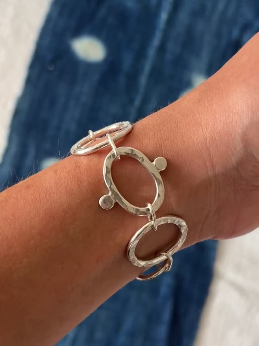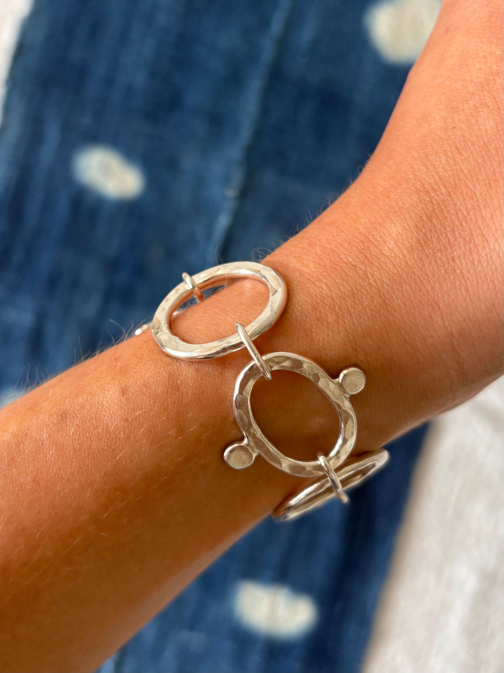 A version of my new favorite motif, this piece pairs embellished ovals with larger chunky circles. Each component is organically formed, finished with a hammered texture. Completed with a stylish hook clasp