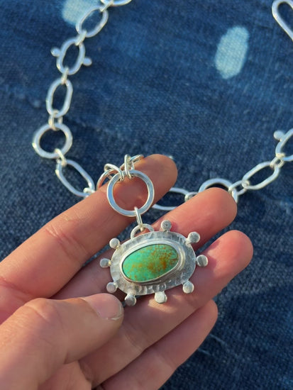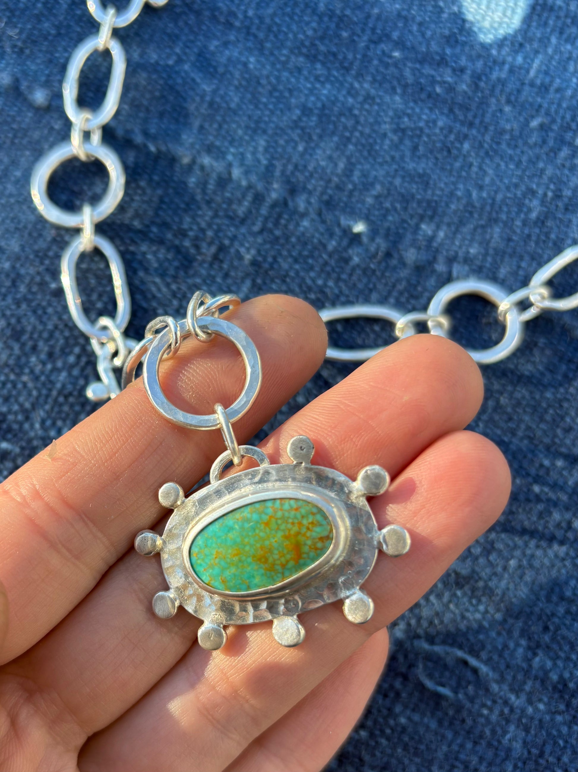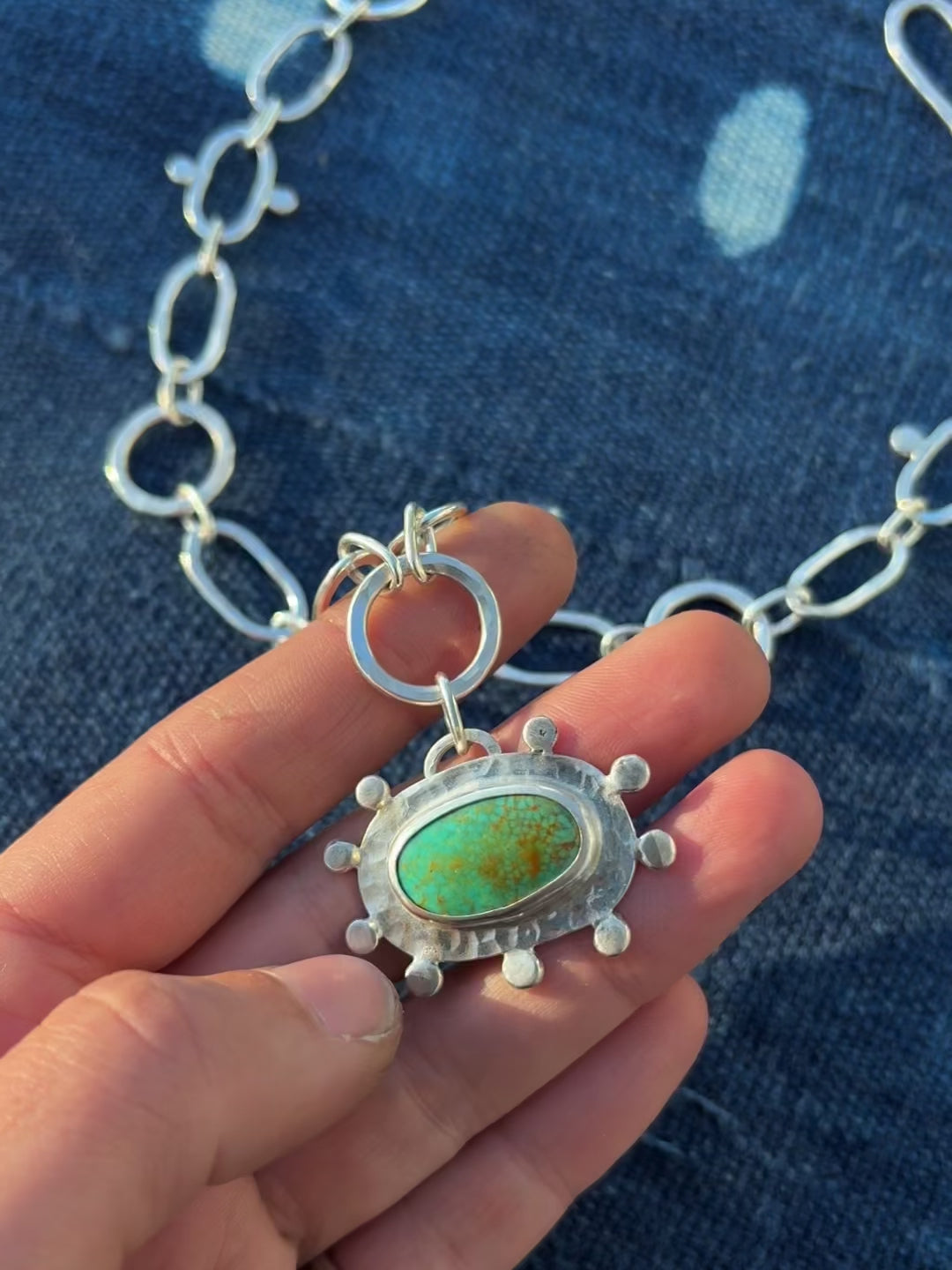 A one of a kind piece for a one of a kind stone, gorgeous delicate matrix deals in this Pilot Mountain Turquoise from Nevada. The embelished pendant is affixed on handmade chain finished with a hook clasp and an extension chain for slight length asjustablity