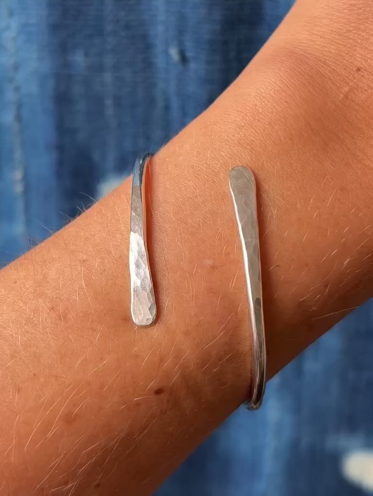Hand formed cuff bracelet with overlapping hammered edges. Adjustable, gently pull apart to slip on, squeeze and adjust to your wrist