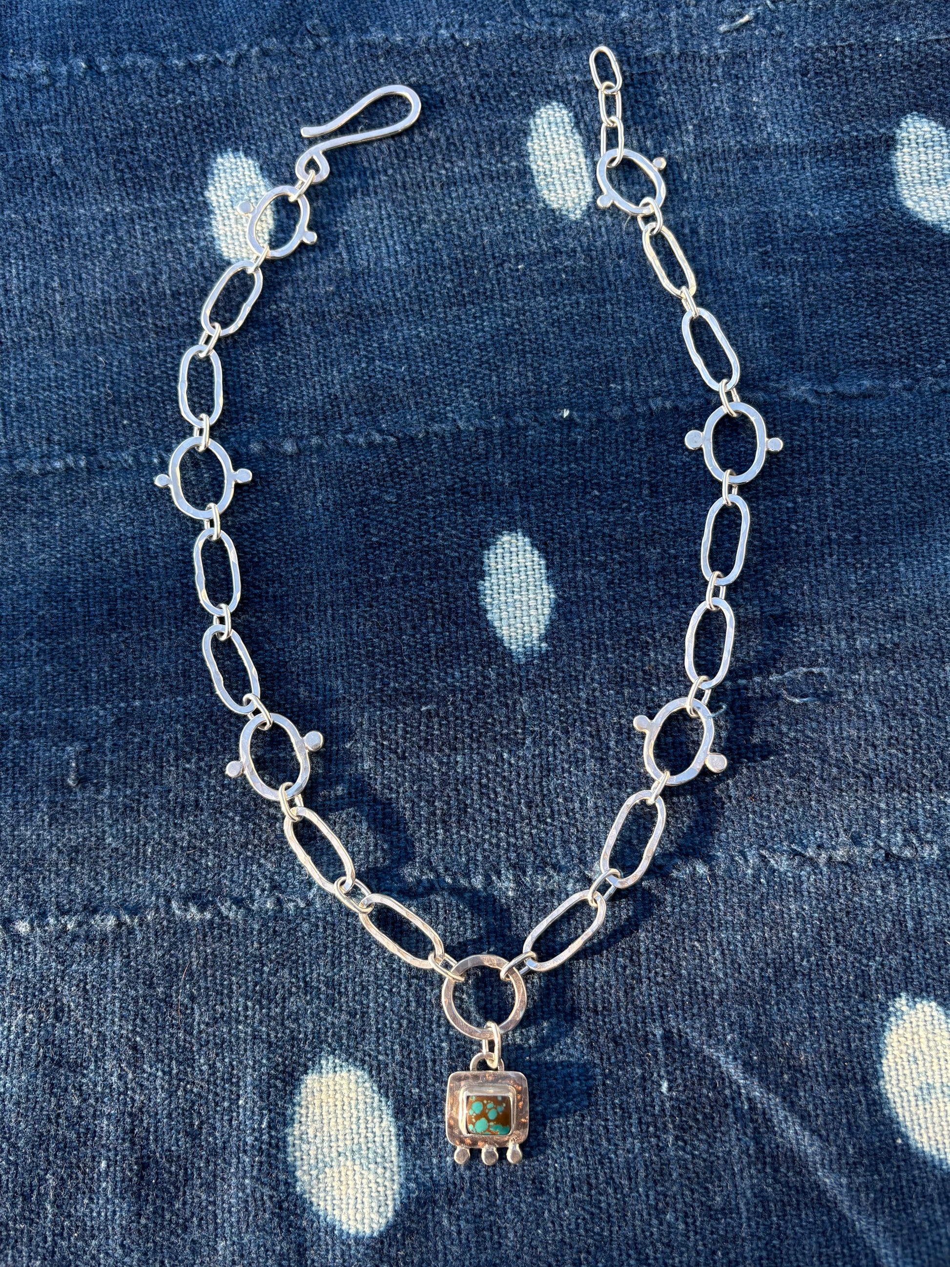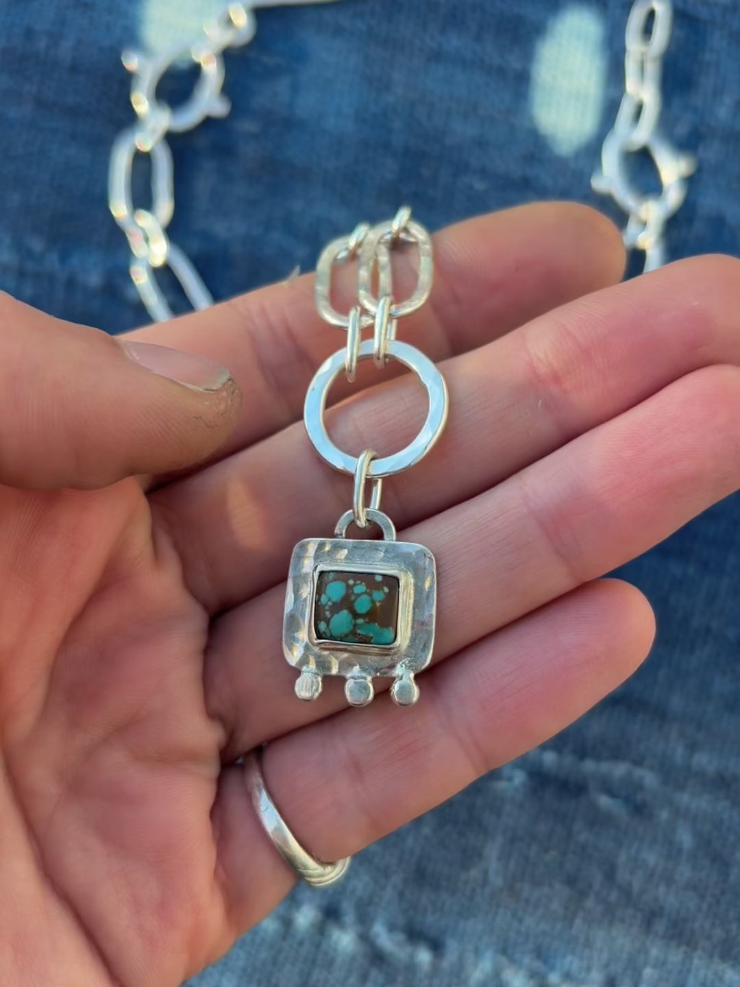 Lovely little square Thunderbird Turquoise, hand cut, hammered and embellished backing. The pendant is affixed on handmade chain finished with a hook clasp and an extension chain for slight length adjustability
