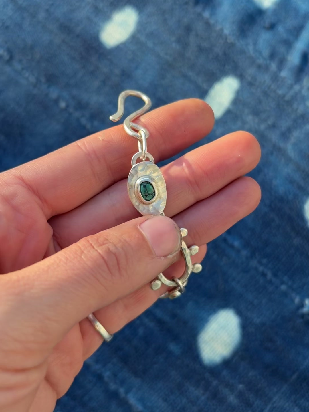 This bracelet features three natural Tyrone Turquoise, from New Mexico. The stones are bezel set on hammered orbs, spaced with hand formed embellished links and finished with a stylish hook clasp